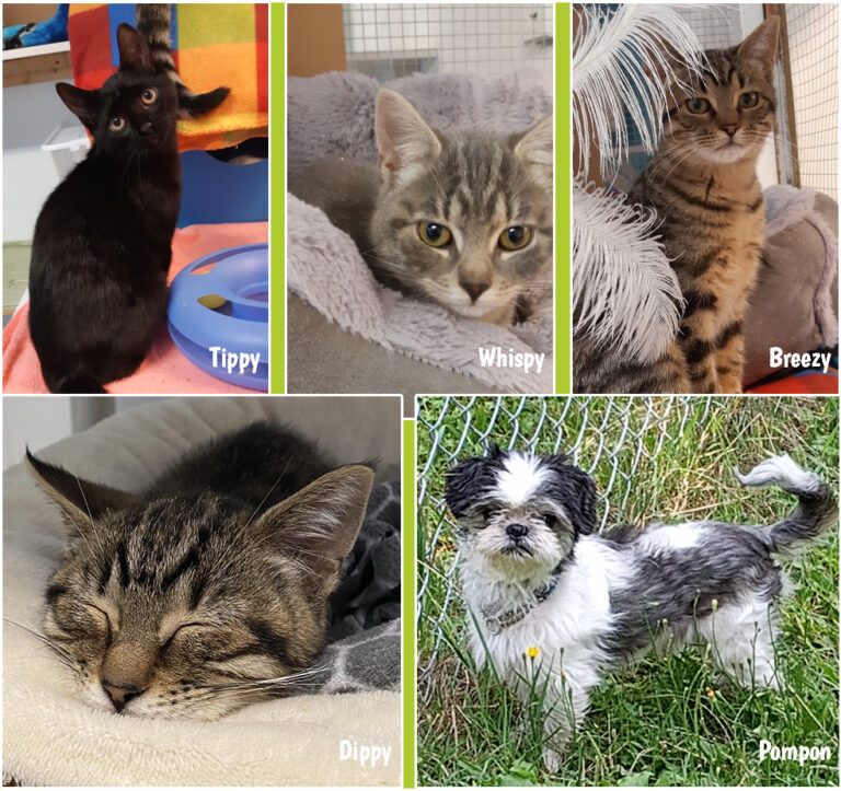 Tippy, Whispy, Breezy, et Dippy, (les petits chatons abandonnés dans un fossé), ainsi que le doux Pompon tiennent à vous remercier de leur avoir offert de l’espoir et une deuxième chance.